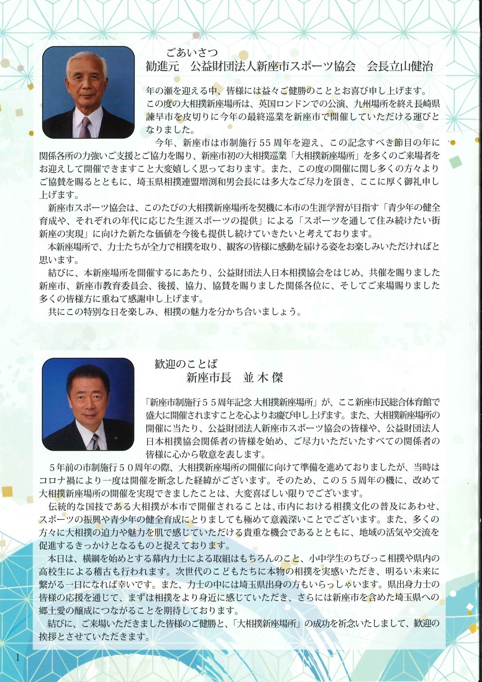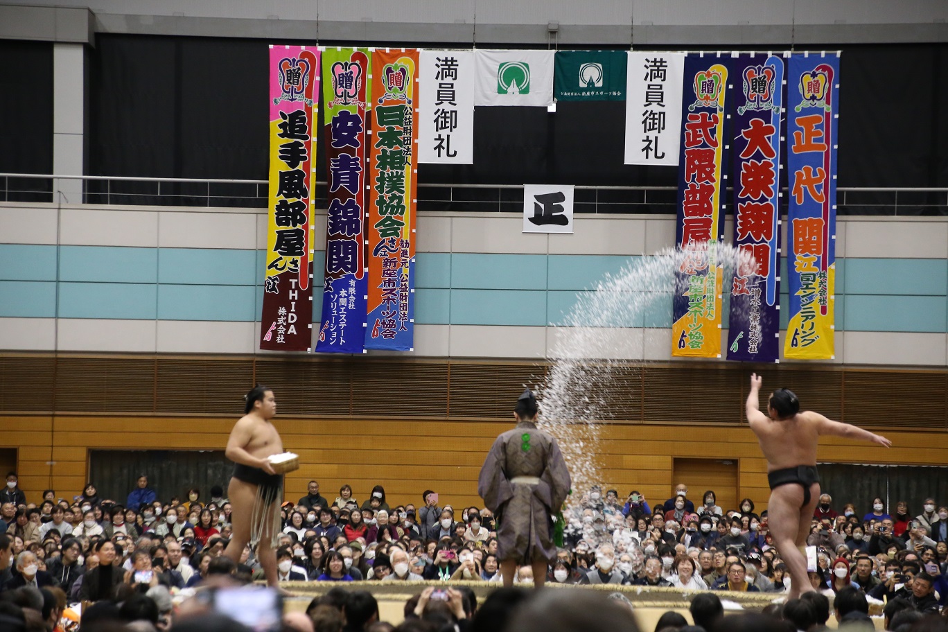| 大相撲新座場所(御礼) この度の大相撲新座場所の開催にあたり、多くの企業団体の皆様から多大なるご支援を賜りました。 中でも「有限会社本間エステートソリューション様」、「THIDA 株式会社様」におかれましては、いち早くご協賛に名乗りを上げていただき、計画段階から力強いご支援ご協力を賜りました。これを皮切りに、冬巡業最大となる67本の幟の掲出にいたるなど、新座場所を大いに盛り上げる契機となりました。 ![]() 大相撲新座場所にご来場・ご協力を賜り、誠にありがとうございました。無事に開催できましたのも皆様のおかげと心より感謝申し上げます。 開催を迎えるにあたり、多くの団体・企業様からご協賛・ご協力を賜り、また、市民・大学等をはじめとした有志ボランティアの皆様のご協力をいただきました。おかげ様をもちまして、市民総合体育館はじまって以来となる3,500名を超える皆様にお楽しみいただくことができました。初めての開催ということもあり、不手際もあったことと存じますが、地元の皆様に相撲を楽しんでいただき、「未来にずっと 暮らしに『プラス』が生まれる 豊かなまち 新座」の一助となればと一心不乱に進めてまいりました。今回の学びを元に、当協会のスポーツ推進活動をさらに進めてまいりたいと思っております。この度は、誠にありがとうございました。 大相撲新座場所 勧進元 立山健治 |